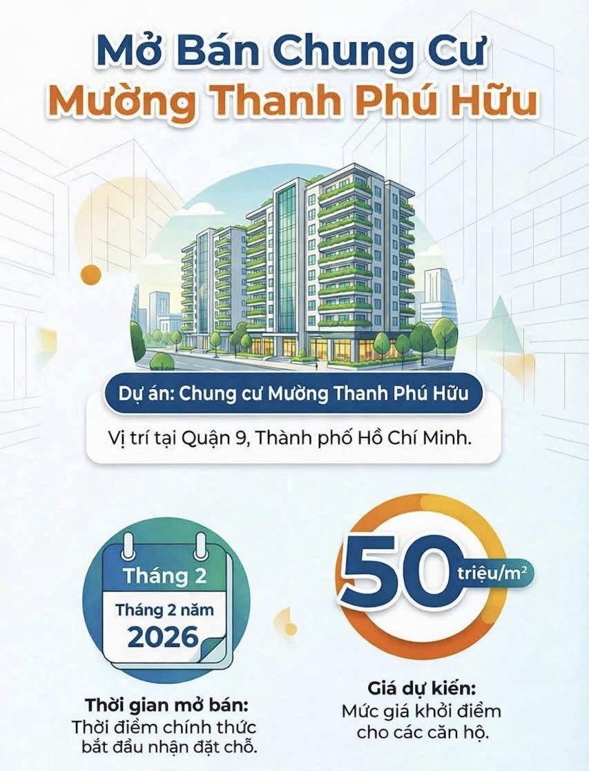 Chính thức khởi động dự án chung cư mường thanh Phú Hữu chủ đầu tư công ty Phố Xanh của tập đoàn Mường Thanh. Toạ lạc tại đường Võ Chí Công quận 9 cũ.
