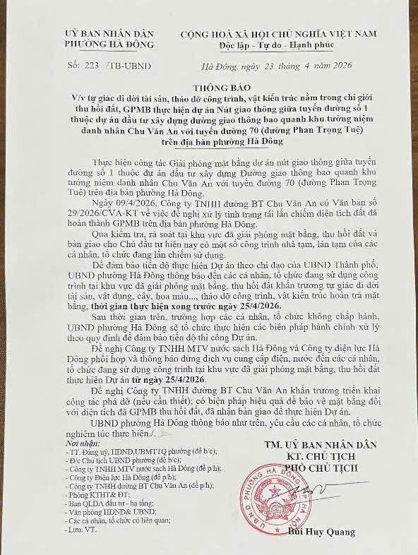 UBND Phường Hà Đông vừa ban hành thông báo số 223/TB-UBND ngày 23/04/2026 về việc yêu cầu di dời tài sản, tháo dỡ công trình để phục vụ thi công dự án nút giao thông trọng điểm giữa tuyến đường số 1 và đường 70 (Phan Trọng Tuệ).