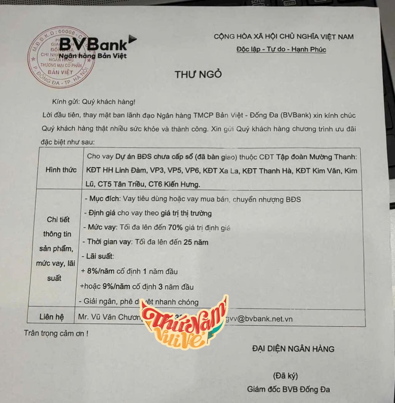 Ngân hàng Bản việt cho vay chung cư thanh hà 8%/năm lên tới 70% giá trị định giá.